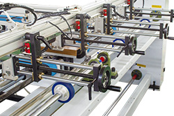 主机输纸部采用四条输纸皮带墙板均可调节移动;压纸装置采用压力可调绝缘质胶轮组合接纸、送纸,异形纸张还可根据形状前后移动位置,保证接纸同步稳定、送纸不打滑;单张到位等纸防划痕停纸电控功能,可避免两片纸张因走纸先后/长短不一造成的到位等纸磨花现象。